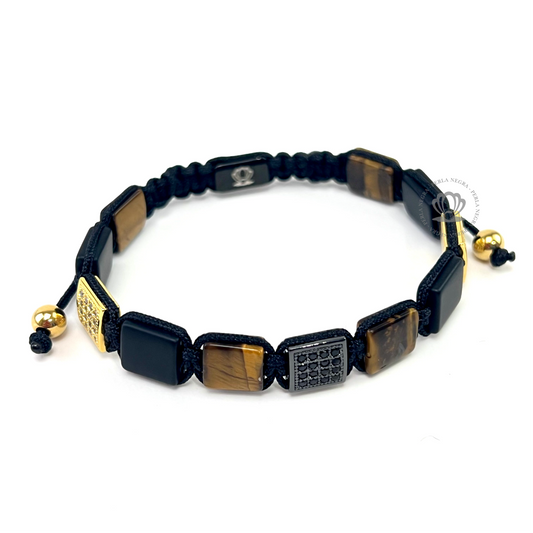 Onyx, Green Tiger Eye, Yellow Gold Cz Square Bracelet